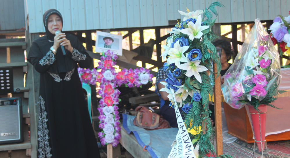 “Almarhum ini merupakan bagian dari keluarga saya, sebab almarhum adalah kemenakan adik Ipar saya sendiri. Saya menyampaikan rasa duka yang sedalamdalamnya kepada keluarga ananda Bongga Parakbak., anandaku saat ini telah berada disisi Tuhan. Kepergian anandaku ini adalah kehendak dari Tuhan yang tidak bisa ditolak dan saya berharap pihak keluarga diberikan ketabahan,”Ujar Nor Baiti yang bericara terbatabata sambil meneteskan air mata, dalam sambutannya.