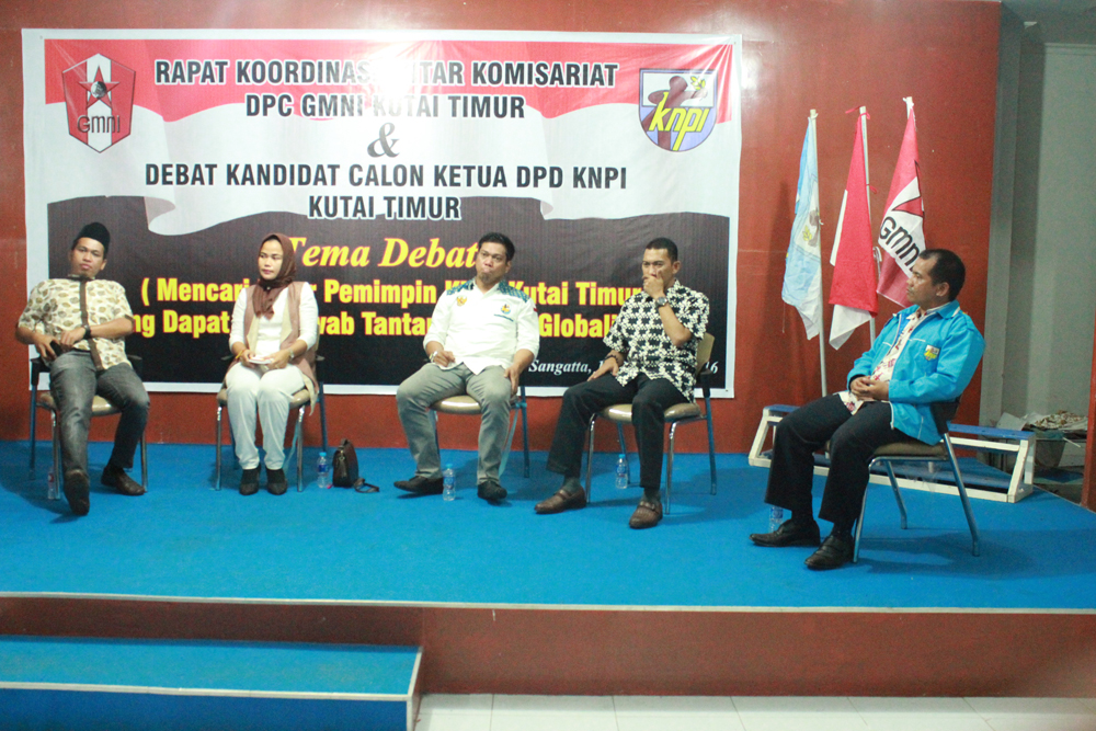 Kandidat yang terdiri dari Munir Perdana, Mariana, Awang Jusnanta, Yakup Fadillah dan Arham, adu argumentasi dalam acara debat Kandidat balon Ketua KNPI Priode 2016- 2019, digelar aula Mahyunadi Gedung Sekertariat DPD KNPI Jalan Soekarno Hatta Sangatta, Kamis (15/12/2016) malam kemarin.