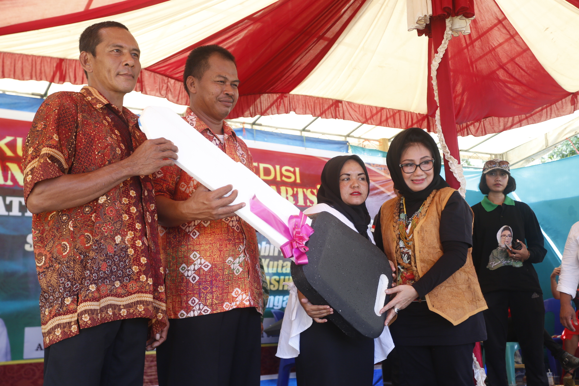 PEDULI KESEHATAN: Bunda Encek Firgasih didampingi Bupati Ismunandar menyerahkan kunci dua unit mobil ambulance di Kecamatan Karangan sebelum kegiatan menelusuri Goa Telapak Tangan di Desa Batu Lepoq. Foto: Irfan/humas