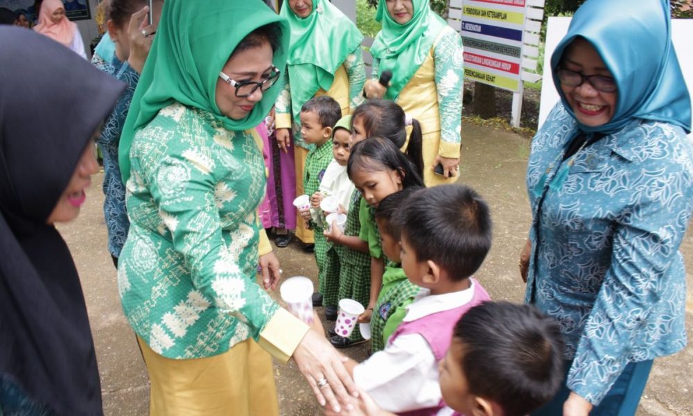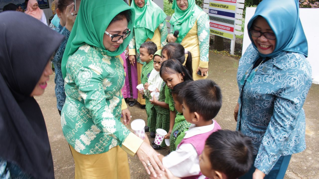 Usai menyerahkan bantuan Bunda Encek Firgasih langsung mengajak para anak – anak TK/PAUD melakukan aksi gerakan minum susu serentak.(hms12)