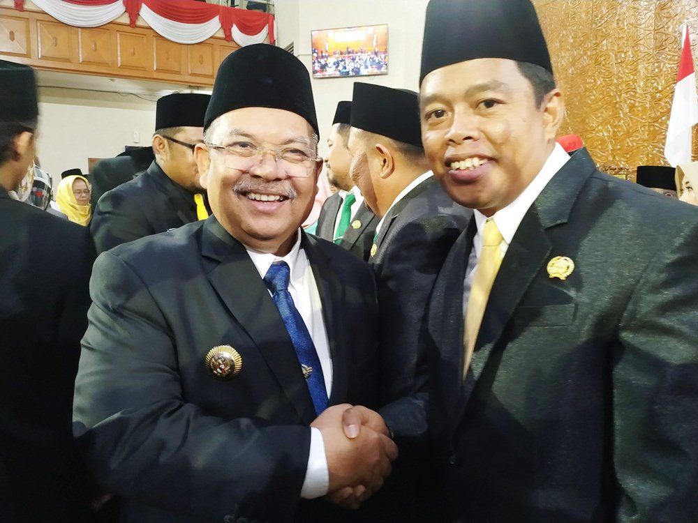 Bupati Ismunandar nampak menyalami anggota DPRD Kutim Marsidik, seusai acara pengambilan masa sumpah jabatan DPRD Kutim periode 2019-2024
