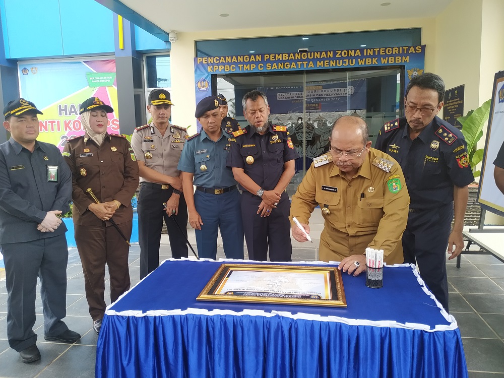 SANGATTA – Dalam rangka menuju Wilayah Bebas Korupsi (WBK) dan Wilayah Birokrasi Bersih Melayani (WBBM), Kantor Pengawasan dan Pelayanan Bea Cukai (KPPBC) Sangatta melakukan deklarasi dan pencanangan pemabangunan zona integritas. Kegiatan yang dilakukan dihalaman KPPBC Sangatta berlangsung pada Selasa (10/12) pagi, yang sekaligus melakukan penandatanganan pakta integritas dengan Pemkab Kutim dalam hal ini Bupati Ismunandar dan Wakil Bupati Kasmidi Bulang.