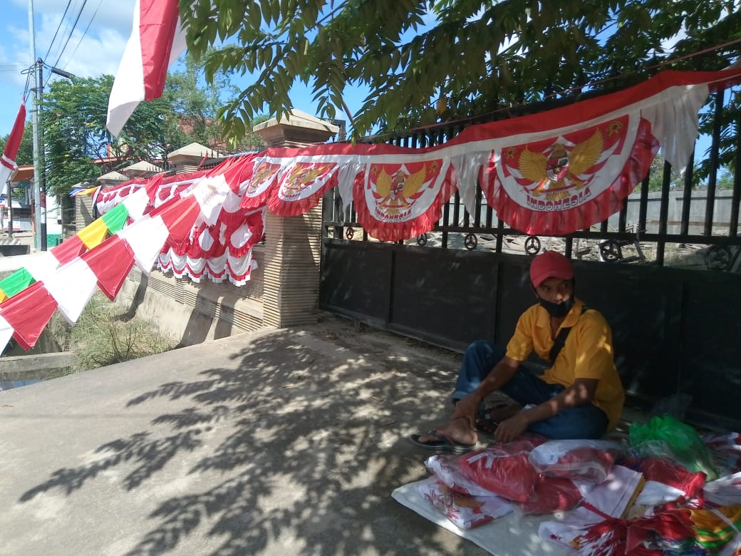 SANGATTA- Pedagang bendera Merah Putih dan umbul-umbul mulai menghiasi Kota Sangatta, Kutai Timur (Kutim), menjelang peringatan Hari Ulang Tahun ke 75 Republik Indonesia. Namun, akibat pandemi Covid 19 omset penjualan merosot lebih dari 50 persen dibanding tahun lalu.