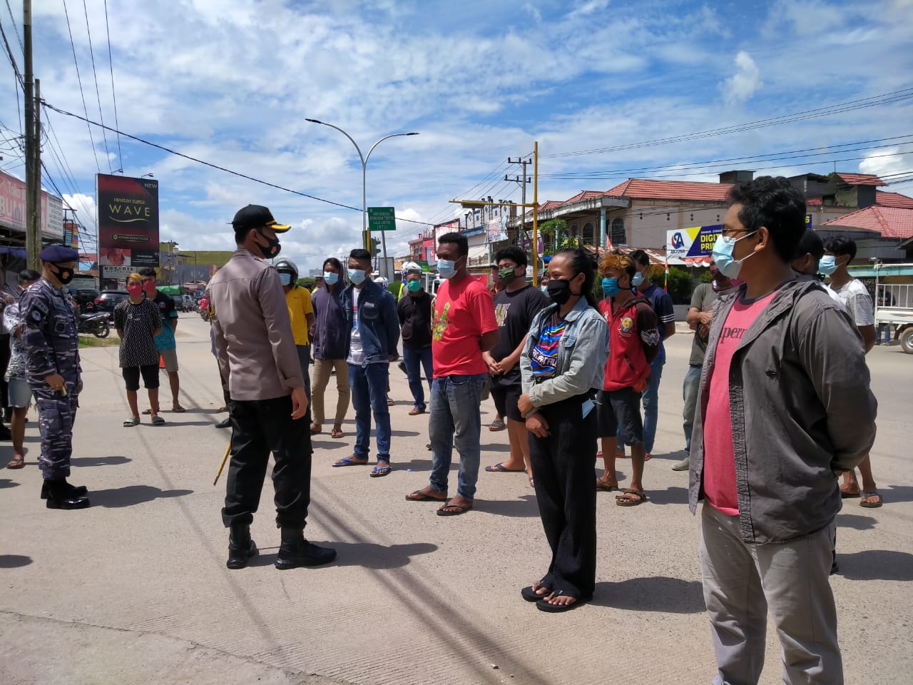 “Hari ini kita melakukan langkah kongkrit, untuk yang tidak menggunakan masker kita berhentikan. Kita juga berikan efek jera dengan berjemur di jalanan biar malu dan tak menyepelekan penggunaan masker. Kemudian kita berikan masker,” ungkapnya.