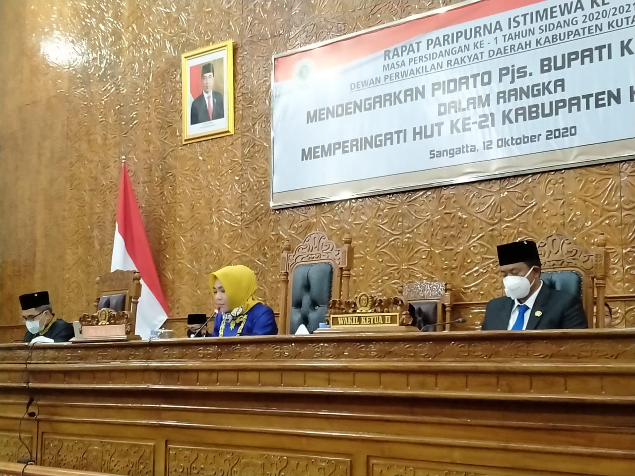 WARTAKUTIM.CO.ID, SANGATTA– Peringatan Hari jadi Kabupaten Kutai Timur ke-21 tahun berlangsung khidmat dan sederhana. HUT Kutim ke 21 yang ditandai dengan sidang paripurna istimewa 1 yang berlangsung di Gedung DPRD Kutim, Senin (12/10/2020), digelar dengan tetap menerapkan protokol kesehatan.