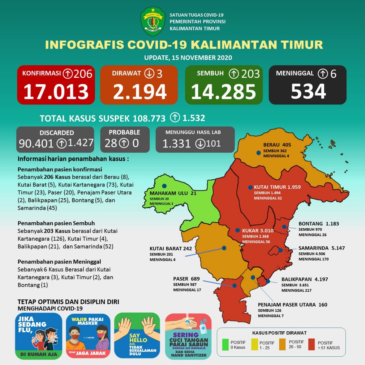 Berdasarkan data yang di rilis dinas Kesehatan Kalimantan Timur, per tanggal 15 November 2020, kasus positif covid 19 sudah menghampiri 2 (dua) ribu kasus.