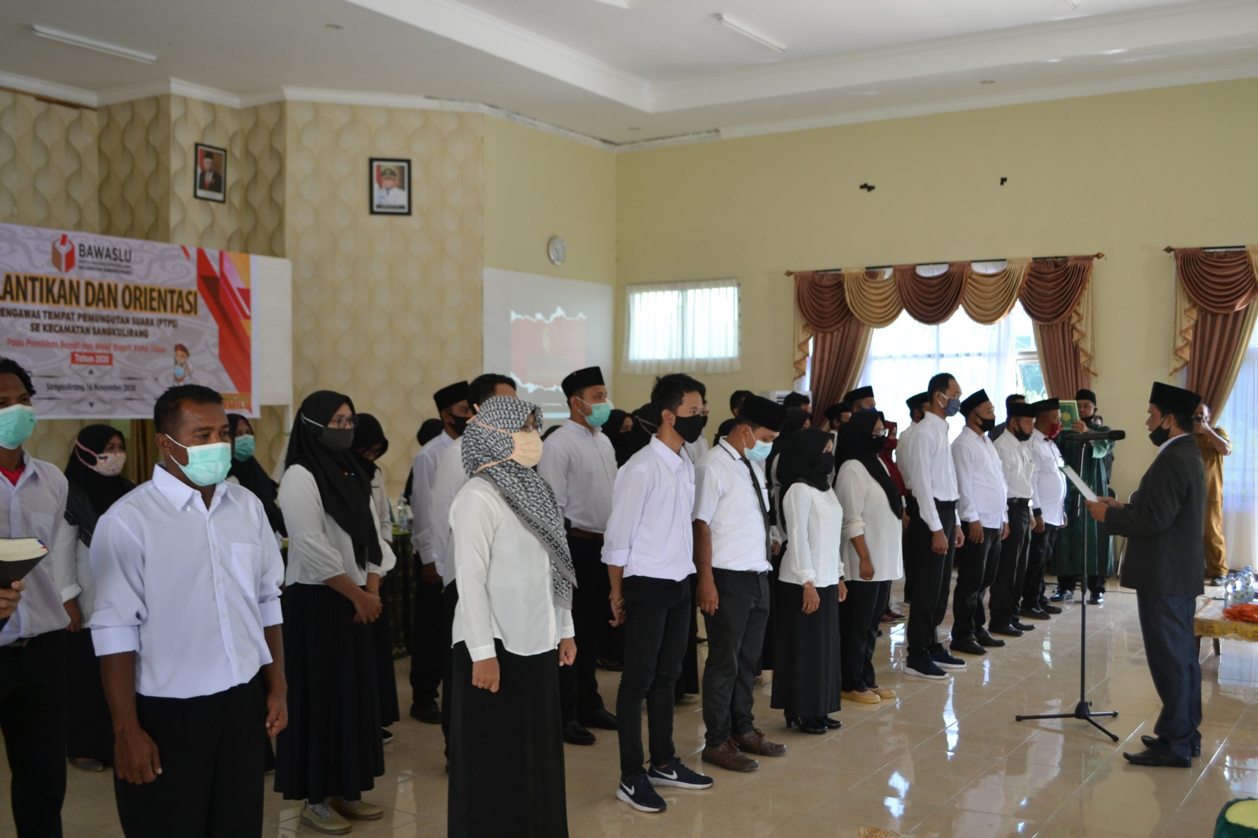 Pelantikan dan Pengambilan Sumpah/Janji dilakukan oleh Ketua Panitia Pengawas Pemilu Kecamatan Rudian, S.Pd.I kepada 42 calon pengawas TPS yang akan bertugas di semua Tempat Pemungutan Suara di seluruh wilayah Kecamatan Sangkulirang. Bertindak sebagai rohaniwan, Bapak Fatahuddin, S.Pd.I dan Bapak Talan.