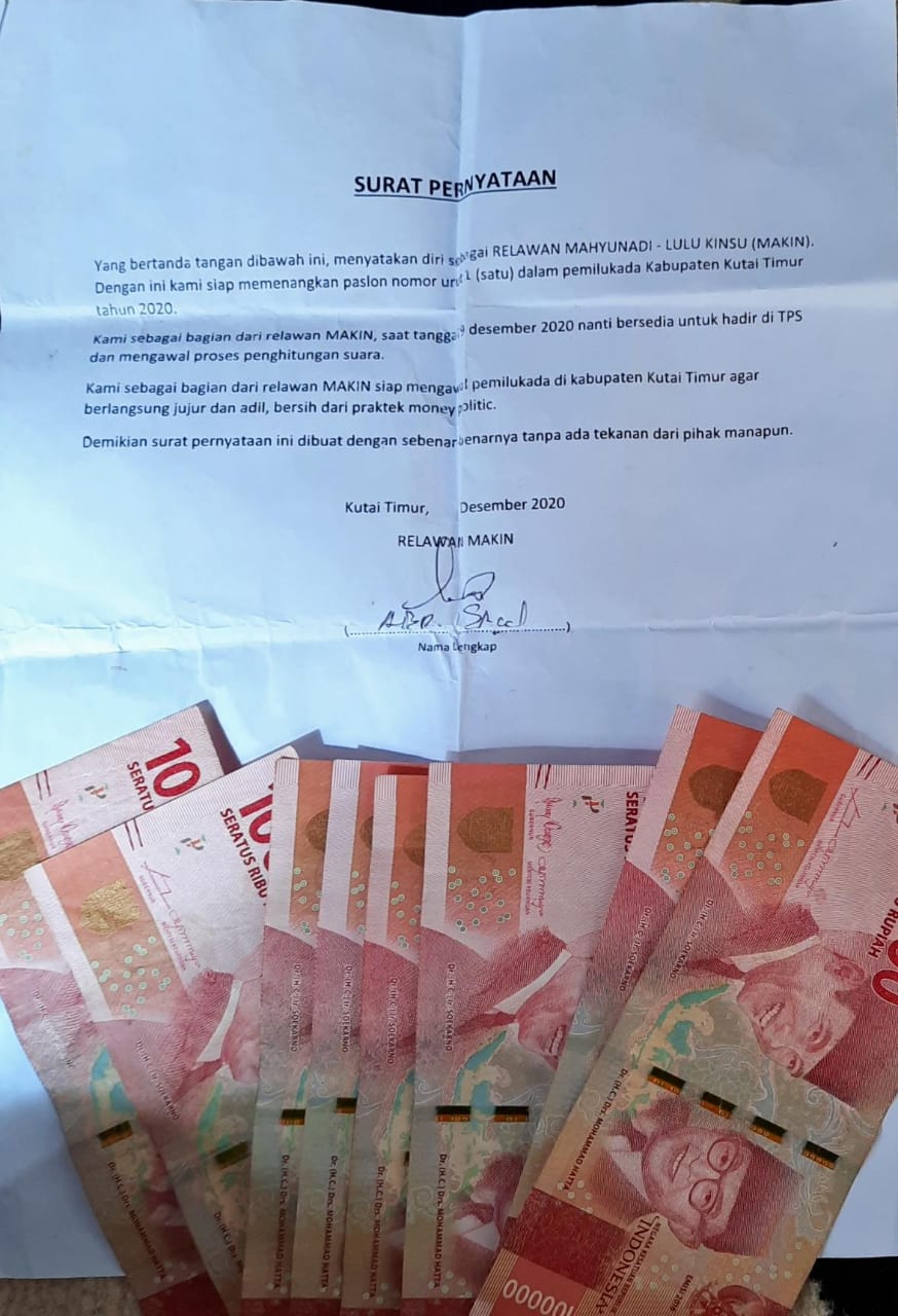Lebih lanjut ia mengatakan, adapun laporan dugaan money politik di Kec Kombeng hampir sama dengan yang ada di Kecamataan Sangkulirang termasuk bukti bukti yang di berikan terduga pelaku kepada target penerima money politik.