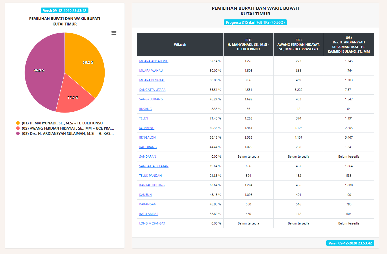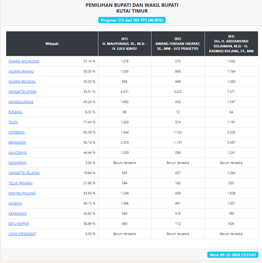 Terdapat dua kecamatan yang belum memiliki data yakni Kecamatan Sandaran dan Long Masengat. Data yang diterima hingga saat ini Progress: 315 dari 769 TPS atau (40.96%) (wal)