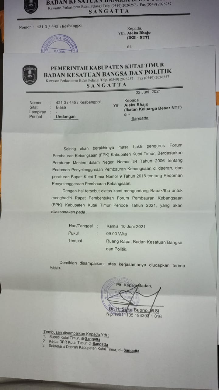 Dalam undangan tersebut, kata dia, tidak tercantum, nama ketua dan menyebutkan namanya dalam undangan tersebut. Walau diakui ada IKB NTT, sebab ia merasa sebagai pengurus dan menganggap kalau pengurus lain IKB NTT Kutim juga ikut diundang.
