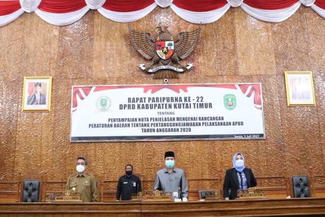 WARTAKUTIM.CO.ID,SANGATTA– Bupati Kutai Timur (Kutim) Ardiansyah Sulaiman membacakan Nota Penjelasan Rancangan Peraturan Daerah Pertanggungjawaban Pelaksanaan APBD Kutim Tahun Anggaran 2020 disaksikan Ketua DPRD Kutim Joni didampingi Wakil Ketua I Asti Mazar di Ruang Sidang Utama Paripurna Gedung Sekretariat DPRD Kutim, Senin (5/7/2021).