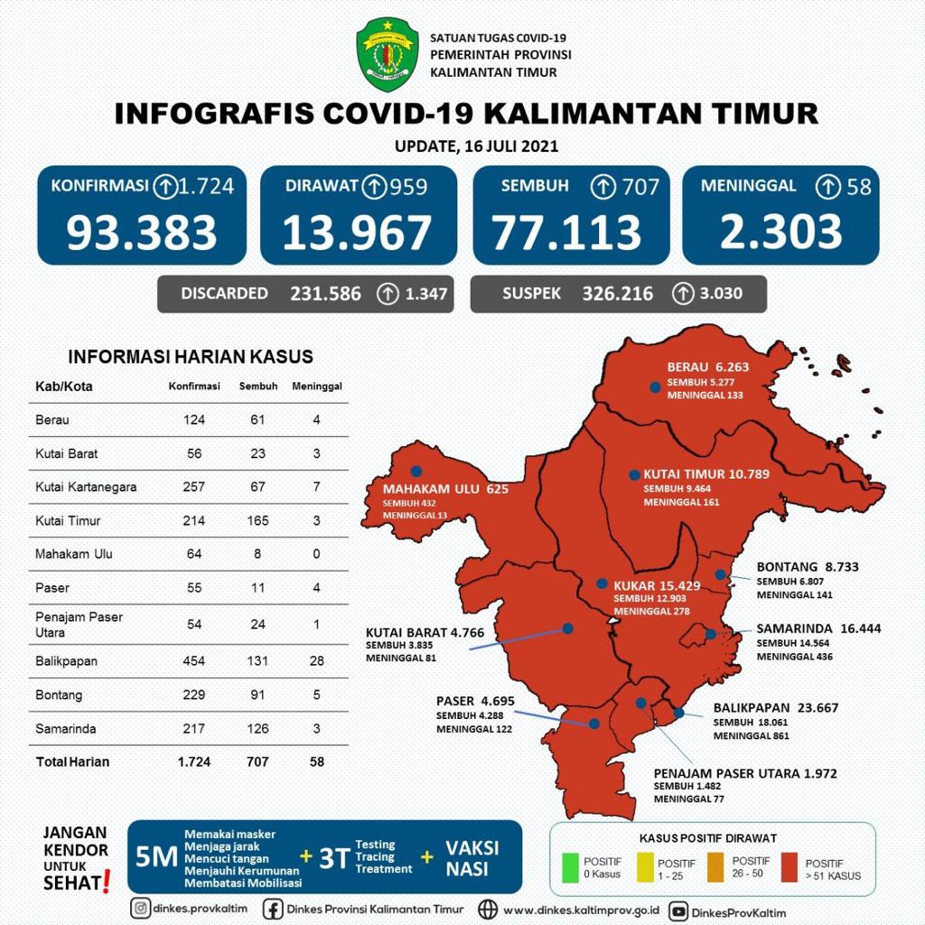 “Hari Jumat (26/07/2021) Jumlah kasus positif bertambah sebanyak 1.724 orang. (total) 93.383 kasus,” ” demikian dikutip dari data Satgas Covid-19 Kalimantan Timur.