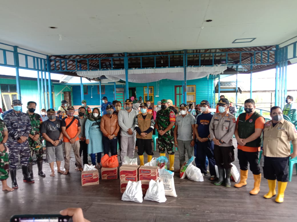 Bupati didampingi, Wakil Bupati Kutim Kasmidi Bulang, memberikan semangat kepada serta menyerahkan bantuan sembako kepada warga terdampak dengan menggunakan perahu (sampan), di Desa Sepaso.