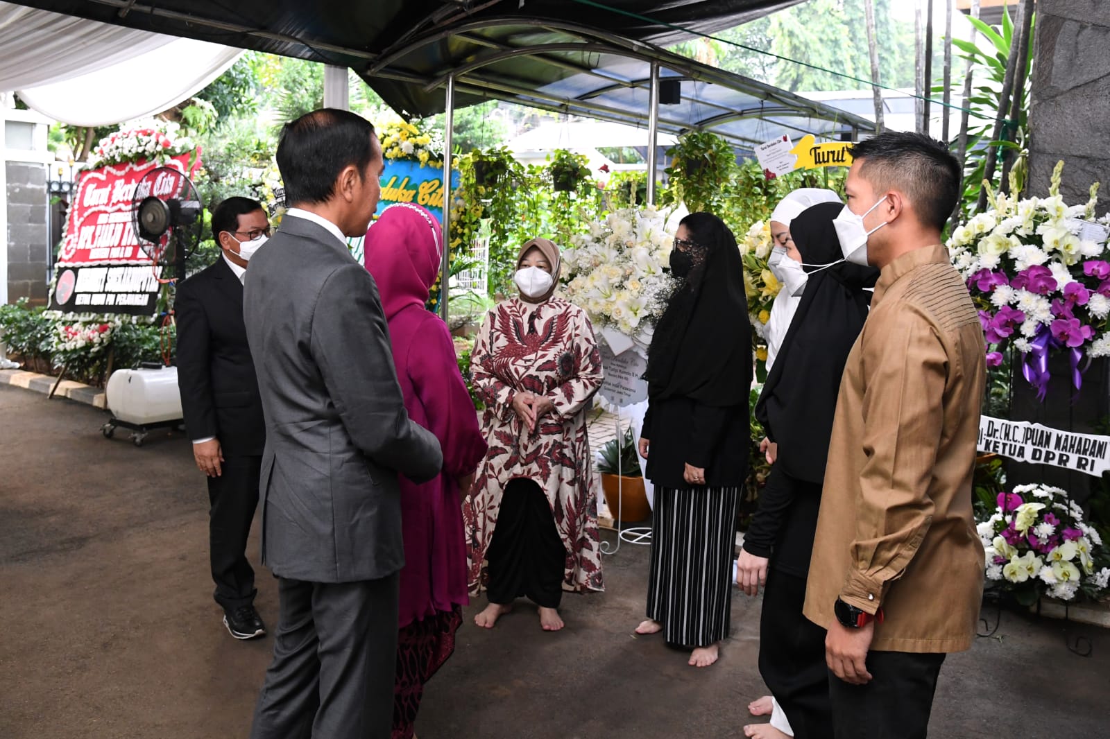 Setelah berbincang sekaligus mendoakan almarhum, Presiden Jokowi dan Ibu Iriana berpamitan dan kemudian meninggalkan rumah duka.