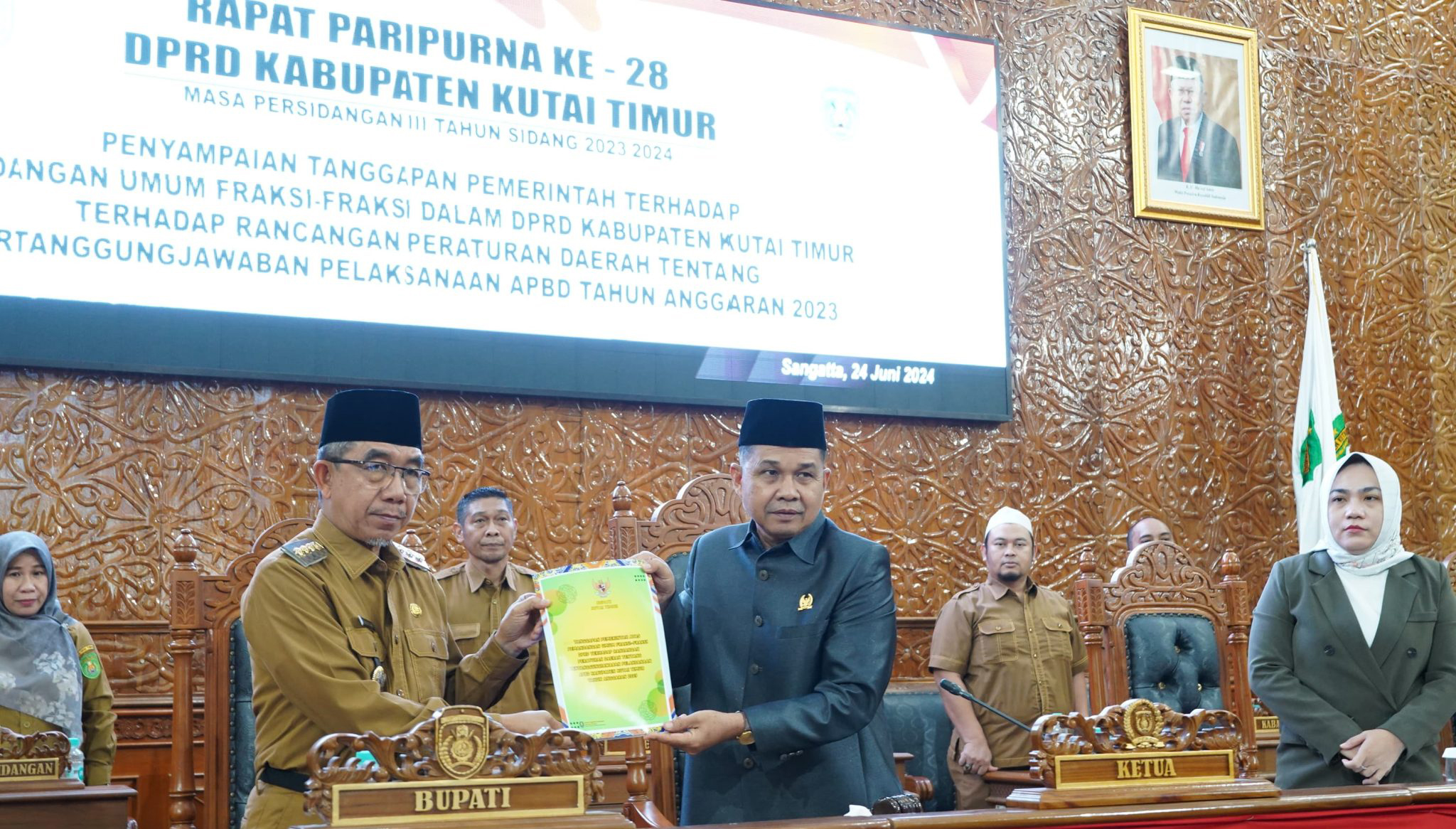WARTAKUTIM.CO.ID, SANGATTA – Dewan Perwakilan Rakyat Daerah (DPRD) Kabupaten Kutai Timur menggelar Rapat Paripurna ke-28 dengan agenda mendengarkan tanggapan Pemerintah Kabupaten Kutai Timur terhadap pandangan umum fraksi-fraksi terkait Rancangan Peraturan Daerah tentang Pertanggungjawaban APBD Tahun 2023. Rapat ini dipimpin oleh Ketua DPRD Kutim, Joni, didampingi Wakil Ketua 1, Asty Mazar, dan dihadiri oleh 21 anggota DPRD Kutim periode 2019-2024.