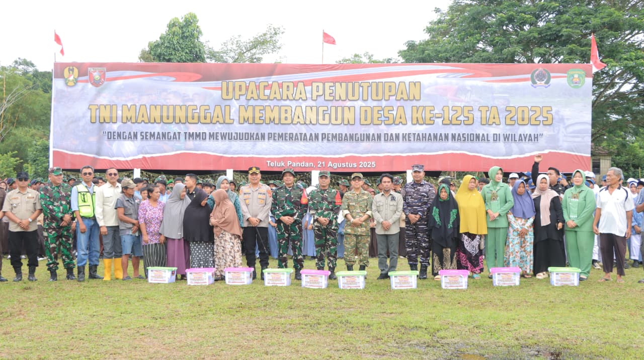 TELUK PANDAN – Penutupan program TNI Manunggal Membangun Desa (TMMD) ke-125 Tahun Anggaran 2025 digelar di Lapangan Pesantren Hidayatullah, Desa Suka Rahmat, Kecamatan Teluk Pandan, Kamis (21/8/2025).